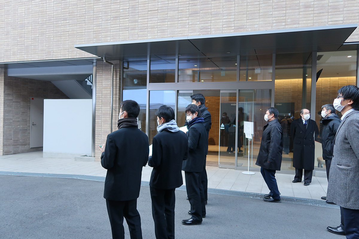 予定では7:50~の入場開始予定でしたが、すでに多くの受験生が集まっていることもあり、この日は予定を繰り上げて7:40から試験会場となる校舎への入場を開始。待機した受験生たちが一斉に会場へと向かいます。