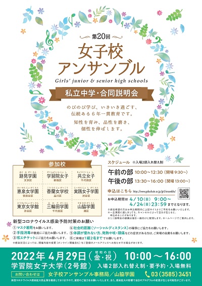 私立女子校9校による合同説明会「女子校アンサンブル」が4月29日(金・祝)に学習院女子大学で開催します。