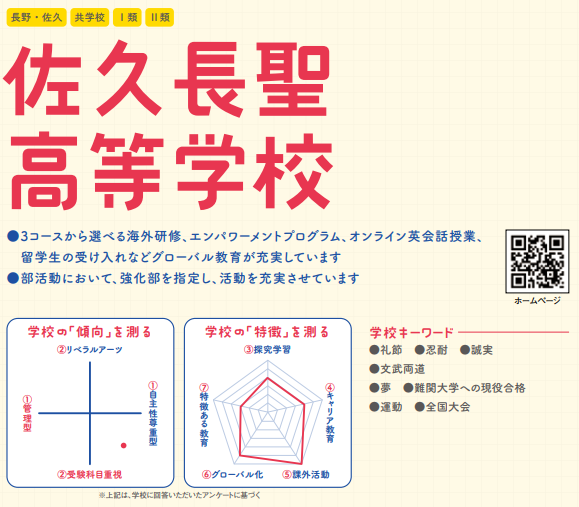 佐久長聖中学・高等学校は、教育方針に「礼節・忍耐・誠実」 を掲げ、一人ひとりが文武両道の中で最高の「夢」の実現 をめざす環境を整えています。 21 世紀の世界をリードできる国際的視野と豊かな人間 性、知性を備えた人財(人的財産)の育成に努めるとともに、難関大学への現役合格を可能とする学力の錬成に全力 を傾けています。県内最高レベルの質の高い授業に加えそれを伝えることのできる教師陣と勉強するための最良の環 境が、生徒たちを支えています。