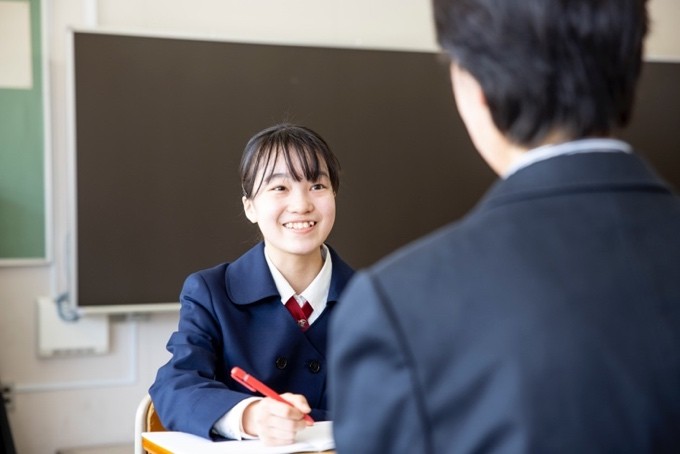 「自ら考える姿勢を養う」を反映したカリキュラムが特徴の桐朋女子。そのために大事にしているのが「対話を重視する」姿勢です。2学期制の同校では、1年に2回、各教科の成績を1対1の面談形式で生徒に伝えます。そこでは、各教科の担当者がコメントの形にまとめた結果を元に、一人ひとりと「できたこと、できなかったこと」などを話しあいます。「私たちが大事にしていることのひとつに『言語化』があります。成績を伝える面談の時にも、生徒自身がノートに記録をとります。まだここが頑張れるね、ということを話しながら自分で成績表を作ってもらう感じです。そのときに感じたこと、考えたことも書き留めることで、次がまた見えてくると思うんです」。生徒たちの未来を見すえる高1学年主任の山口先生の穏やかな語り口からは、温かく見守る姿勢が伝わってきます。こうして大事にされた生徒たちは安心して学校生活を送り、自ら道を開いていく力を身につけていきます。