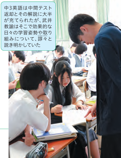 そして、授業の最後、メンバー全員が参加するTeamsに課題をポストする。この辺り、16年~19年度にはすでに「ICTパイロット校」、20~21年度は「Society5.0に向けた学習方法研究校」、22~23年度には「TOKYO教育DX推進校」の指定を、それぞれ東京都教育委員会から受けていた、三鷹の面目躍如といったところ。ちなみに図書館の蔵書は保護者も検索が可能なため、我が子に推薦書の助言もできる。後期課程の2人が自学自習のマインドを身につける過程を知るには、むろん前期課程の通常授業の様子を伺うべき。ただ、取材がたまたま中間試験後にぶつかり、中3英語はその返却と解説が主だった。しかし、これがただの答え合わせとは訳が違う。武井道就生徒の好奇心を沸かせ、活かしたコンテンツが好循環の授業を生む生徒の好奇心を沸かせ、活かしたコンテンツが好循環の授業を生む教諭は成績優秀者の名前を伏せた上で、そのノートをスライドで見せながら、PDCAサイクルについて語っていたのだ。これはPlan(計画)・Do(実行)・Check(評価)・Action(改善)の頭文字を取った、業務や品質改善のためのフレームワークで、統計学者のW・エドワーズ・デミングが1950年代に提唱した。日頃の学習実践でも目標設定が大事で、自己評価やその結果としての改善がなければ、次の段階には進めない。