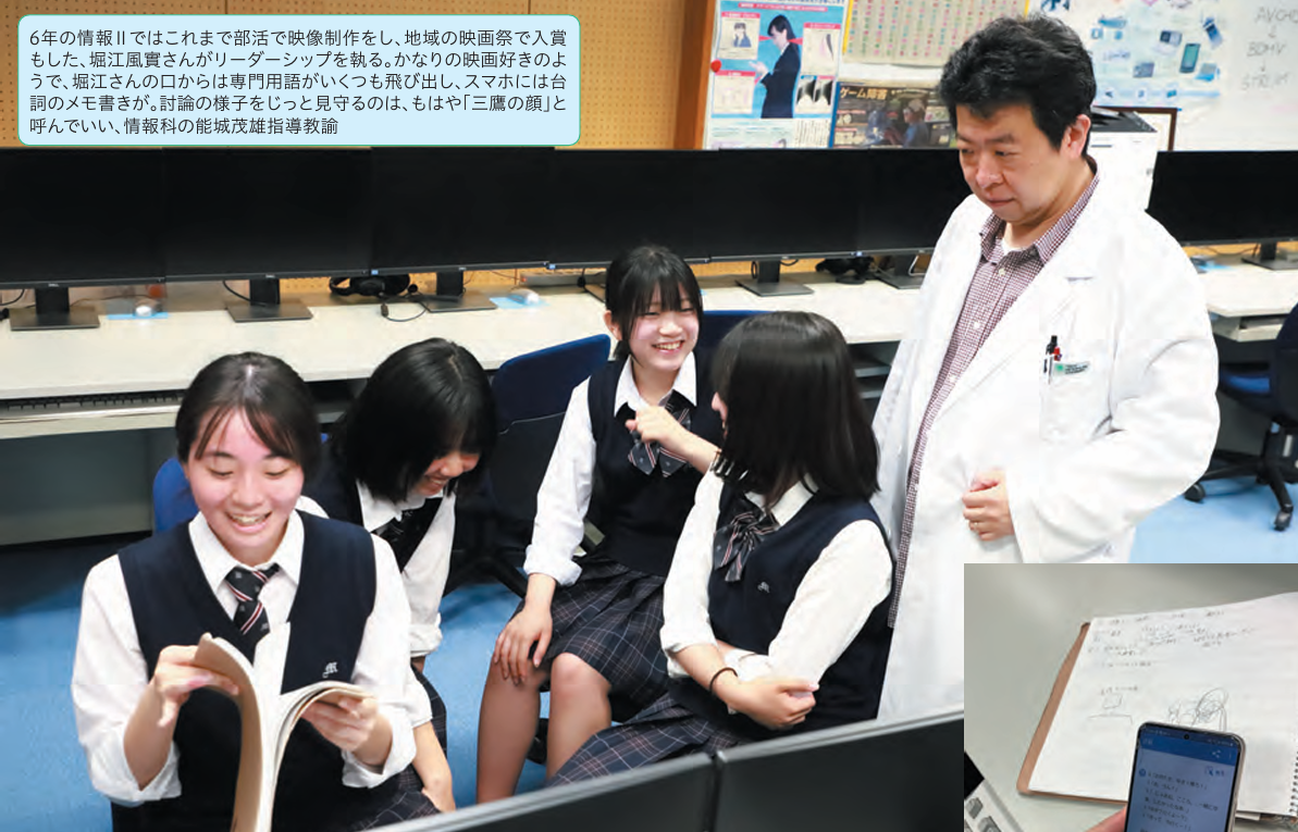三鷹ではそんな好奇心を吸い上げ、授業自体の活性化を図ってもいる。6年生(高3)の選択科目の情報Ⅱでは各グループごとに年間テーマを決め、その相談に入っていた。短編映画を作る堀江風實さんらはひとまず立てたプロットの検討中。堀江さんによれば、「卒業を控えた女子高生2人の何気ない会話の様子だったはずが、次第に増すすれ違いに違和感が募っていき、最後には2人のうち1人がすでに亡くなっており、実は残った1人の独り言だったことが発覚する」という内容らしい。2年の美術では幼児向けの木製玩具を作っていた。まずは使用者のペルソナを書き、下絵を描いてから木工にかかる。右上は南教諭によるデモ作品。米原碧希さんは糸を捻って動力にするメリーゴーランドを考案した「23~24年と連続して、同じUNIX研究同好会のメンバーで『第17回高校生フィルムコンテストin映画のまち調布』に出品し、一昨年は私が演技賞もいただきました。演劇部の子がシナリオを書いて演出もしたんですけど、今年はこれまで演者側だった私がそちらに回るんで気が重いです」と言いながら、堀江さんは絵コンテまでノートに走り書きをし、スマホのメモには思いついた台詞が記してある。3人の仲間を従え、すでにやる気満々の様子だ。