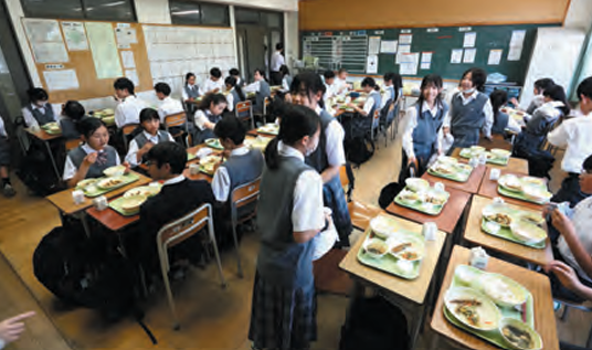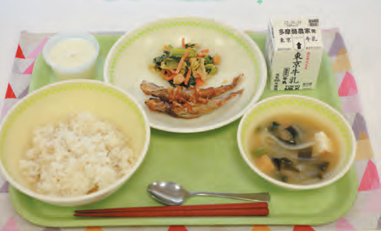 さあ考え抜かれた給食の献立からも感じられる、濃やかな“思いやり”単なるランチではない。給食もまた、食を通じての学びの場面自然食レストランで提供されるような、素朴だが味わい深い給食。この日の一番人気、カルピスゼリーも自家製で、サクサクのリンゴ入りだった。配膳が終わり、全員が着席すると、当番による簡単なメニューの説明の後、声を揃えて「いただきます!」、腹が減っては学びはできぬ。三鷹は自校調理の給食が自慢で、前期過程の生徒は昼休みに各自の教室で食べる。私も実食できた。現在の給食はかくもハイレベルなのかと思わず唸った。取材日の献立は〈麦ご飯/ししゃもの南蛮漬け/春キャベツの練ゴマあえ/新じゃがと新玉ねぎのみそ汁/カルピスゼリー/牛乳〉。牛乳以外はすべて手作りで、昭和年代の小学校の給食と比べると隔世の感がある。地産地消に気を配り、一部有機野菜も使用し、化学調味料は一切使わず、素材の持ち味を充分に引き出している。滋味に富んで、空腹以上に心を満たす、これぞ“食育”というクォリティ。栄養士の佐藤愛紗さんは新卒で三鷹に赴任し、都立校の栄養士間の勉強会にも熱心に参加し、先輩たちの経験値に刺激を受けながら、時にその発想を取り入れつつも独自の献立を考案してきた。
