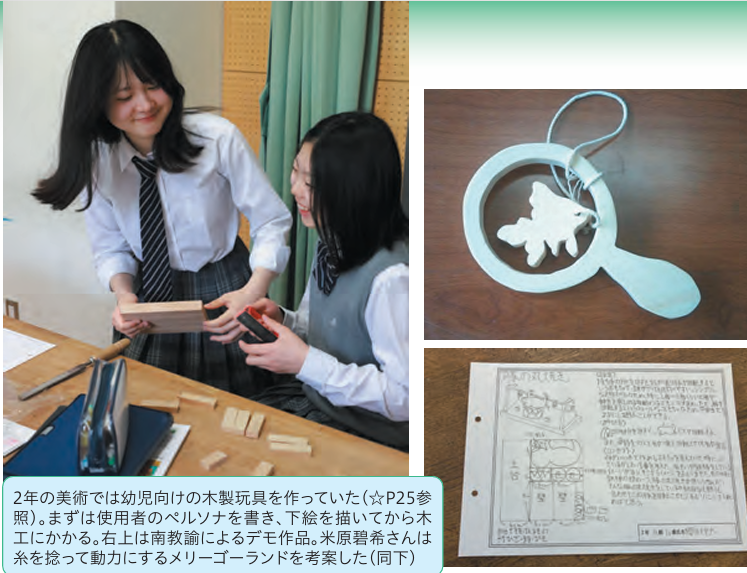 生徒の内発的な創造性をいかに高めるか。それには他者に対する想像力が豊かになるよう導くのが一番。まさに三鷹のモットーの「思いやり・人間愛」を持たせることだ。まずもってしかし、それは家庭の役割だった。だが、SNSでデマが拡散し、生成AIがそれを鵜呑みにし、真しやかな嘘をついてしまう昨今、他者に想像力を及ばせるにも、確かな素材選びが問われる。その好例を私は三鷹の美術の時間に見出した。三鷹では家庭科や音楽にも専任教員を置くが、美術の南弥緒指導教諭も同様。2年の授業では幼児向けの木製玩具を作っていた(写真)。糸鋸の扱いに悪戦苦闘する生徒が多かったが、前回の授業で南教諭がすでに想像力のスイッチを入れていたため、おざなりの作品を作る生徒はいなかった。そこで南教諭はパワーポイントで作成した10数ページの資料を見せた。日本の民藝玩具とともに先輩らの作品を見せるのと同時に、使用者を思い浮かべ、心を込めて作れるよう、生徒らにそのペルソナ設定を書かせていたのだ。南教諭自身、資料にはこう記した。