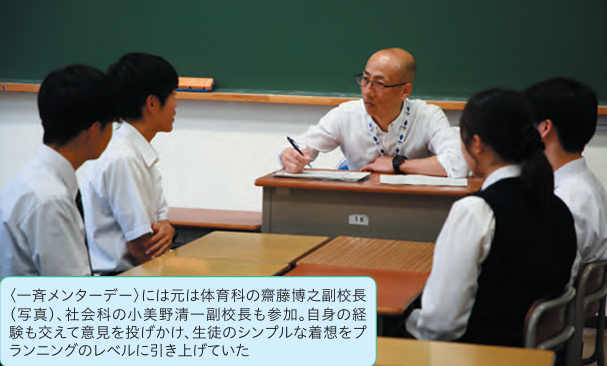 下絵を描いてから実作にかかるが、櫻井煌太君は『豚の丸焼き』と題し、炎の上でぐるぐる回る豚を軽妙に図案化していた。鉄棒にぶら下がる運動、通称“豚の丸焼き”から思いついたのだという。安全性を考慮し、ペンキもニスも塗れない制約も、「板の木目を活かして“焼け焦げ”を表現してみます」と櫻井君はいう。動作のある玩具は組み立てが難しいせいか、かなりの生徒がパズル制作を選択する中、完成を待たずとも、この二人のチャレンジには拍手を送りたい。そして、放課後には〈一斉メンターデー〉が行われた。4・5年生を対象に総勢60人の教員が一人当たり4人から6人の生徒を担当し、探究の課題相談に乗る機会である。そこには小林校長はじめ、二人いる副校長も参加。もともと現代社会担当の小美野清一副校長の元に集まったのは、「株」「投資」といった、教科でいえば政治経済や現社の範疇のテーマを掲げる生徒たちだった。