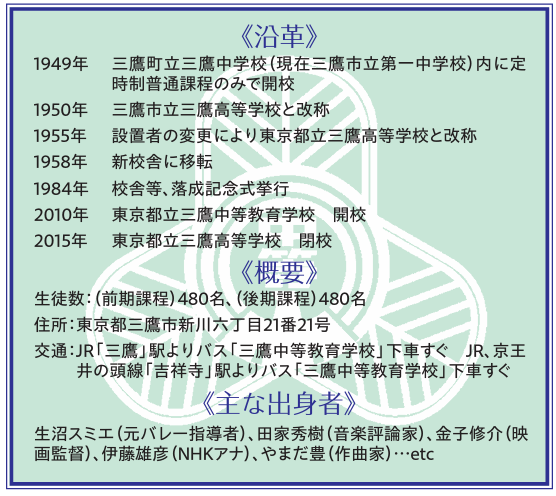 三鷹中等は三鷹市の南東部に位置し、緑に恵まれた環境にある。三鷹の地名は徳川将軍家や尾張徳川家の鷹狩用の領地、「鷹場」から来ており、ことに学校の周辺はその名残をいまだ感じさせる。三鷹・吉祥寺・仙川とどの駅からもバスでならすぐだが、徒歩圏ではなく、落ち着いた学習環境が担保されている。そこにも三鷹が選ばれる理由があろう。三鷹の建つ一帯はかつて国立中央航空研究所だった。今もある調布飛行場開設の1939年に同時に建てられた。近隣の広大な中島飛行場三鷹研究所は現在、国際基督教大のキャンパスだ。三鷹は航空の街だった。下請け工場も多く、労働者のための社宅も数多く建設され、1935年には2万人に満たなかった人口は、その後の10年間で4万人台に突入し、40年には町制が施行された。そして戦後を迎え、49年に最初は三鷹町立高校として誕生したのが三鷹中等なのだ。50年に三鷹市が市制を施行したので、市立三鷹と改称し、程なく55年4月よりに都立に移管された経緯がある。だから、他の都立校以上に地域と密着してきた。