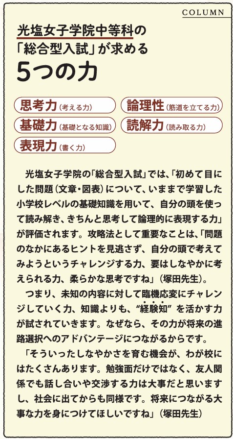 塚田先生: もちろん教科横断型という意味では「適性検査 型」との共通項はあると思います。でも光塩の「総合型入試」 は、いわゆる「〇〇型」のように型にはめる必要はないと思っ ていますし、都立校のどこかを意識して作問するというこ ともまったくありません。