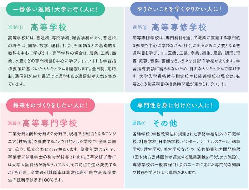 小学校や中学校に受験はなかったのに(公立の場合)、なぜ高校進学に受験があるかといえば、高校は義務教育ではないからです。つまり高校へ行くのは義務ではなく自由。行っても行かなくてもいいのですが、高等教育はその後の人生を豊かにする教育として多くの人(東京都の場合98.9%)が選ぶ教育となりました。そして高等教育は自由な分、その裾野は広く、普通科だけではなく専門的な教育をする学校もあり、多様な選択肢の中から選ぶことができます。