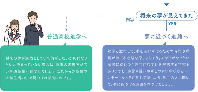 「自分は文系なのか理系なのか」「まだ何も考えていない」「将来の夢がない」など、15歳で進路を考えることはまだ早いことかもしれません。ですが高校には、いろいろな選択肢が用意されており、後からそんな進路があったのかと後悔しないためにも今考えてみて欲しいのです。特に中学校の学びに違和感がある人には、専門的な学びをする学校に進むという選択肢もあるのです。ここでは、進路を探るステップをご紹介します。
