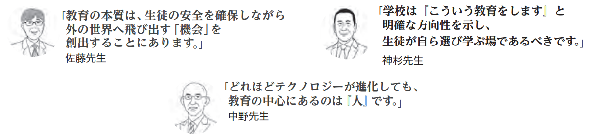 【神杉先生】AI や ICTの急速な進化により、教育は大きく変わろうとしています。時間や場所、さらには教員までも自ら選べる時代が目前に迫り、生徒は他校の授業や体験も自由に選択できるようになるでしょう。そんな中、学校は「こういう教育をします」と明確な方向性を示し、生徒が自ら選び学ぶ場であるべきです。これまでの教育は、横並びの比較による「こうでなければならない」に支配されてきました。しかしこれからは、個々の価値が尊重される時代です。学校は知識を教える場であると同時に、困難な時に心の支えとなり、記憶に残る人間的なつながりを築く場でなければなりません。子どもは単に大人になるための存在ではなく、その時々に意味があります。成長を一律に整備するのではなく、自然な体験を通じて学ぶことが大切です。DX などのツールを活用しつつも、人間としての温かさを忘れず、生徒の記憶に残る教育を目指していきます。私立学校の価値は、卒業後も帰れる場所であることです。城西大学附属城西で行われる同窓会には、戦争を経験した90代の卒業生から19歳の若者までが集まり、学校の歴史と人のつながりが未来へと続くことを改めて感じることでしょう。