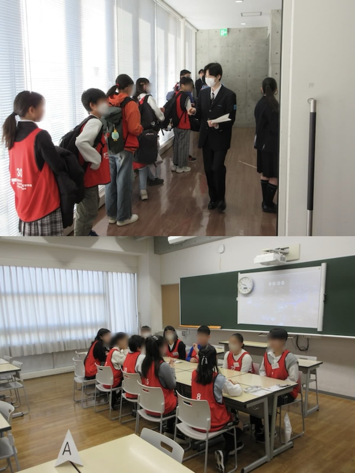 午前7時30分、最初の受験生が姿を見せました。試験会場と待合室を兼ねた「つばさホール」には、8時10分の時点で既に半数以上が揃います。受付を済ませた受験生は、会場で赤いビブスとネームカードを受け取ります。このビブスは検査Ⅰの作文から着用し、そのままグループワークへと続きます。8時30分、出欠確認が始まると先生方が一人ひとりの顔とビブスの番号を丁寧にチェックします。67名が挑む倍率9.6倍——その数字を知ってなお、この入試を選択した受験生たちの表情には、緊張と静かな覚悟がにじんでいました。