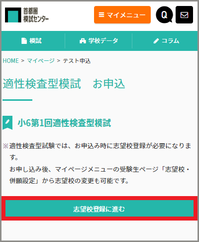 6年生は全ての志望校(最大6校)を登録した時点で受験科目が確定します。(5年生は全員が適性検査Aと適性検査Bの2科目)